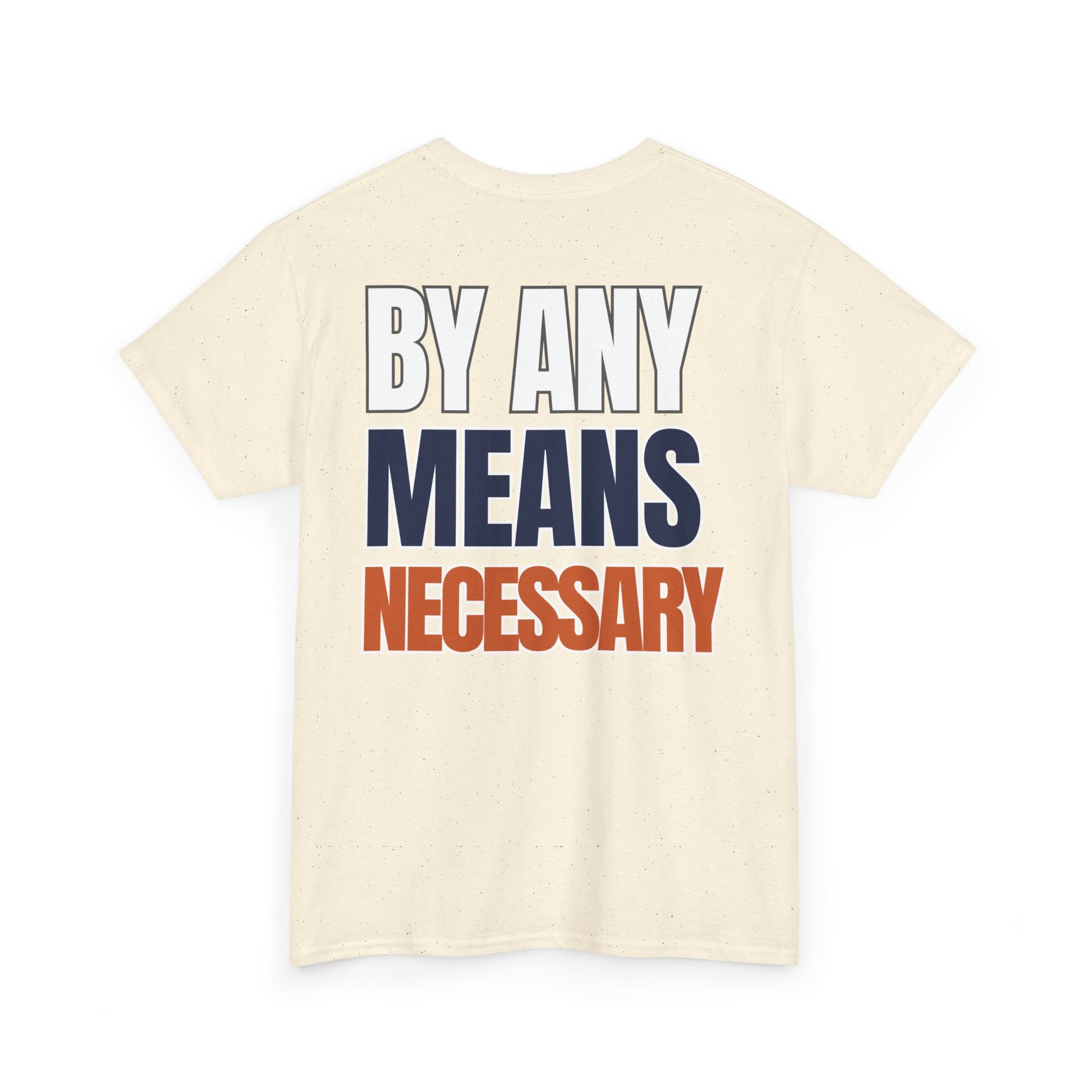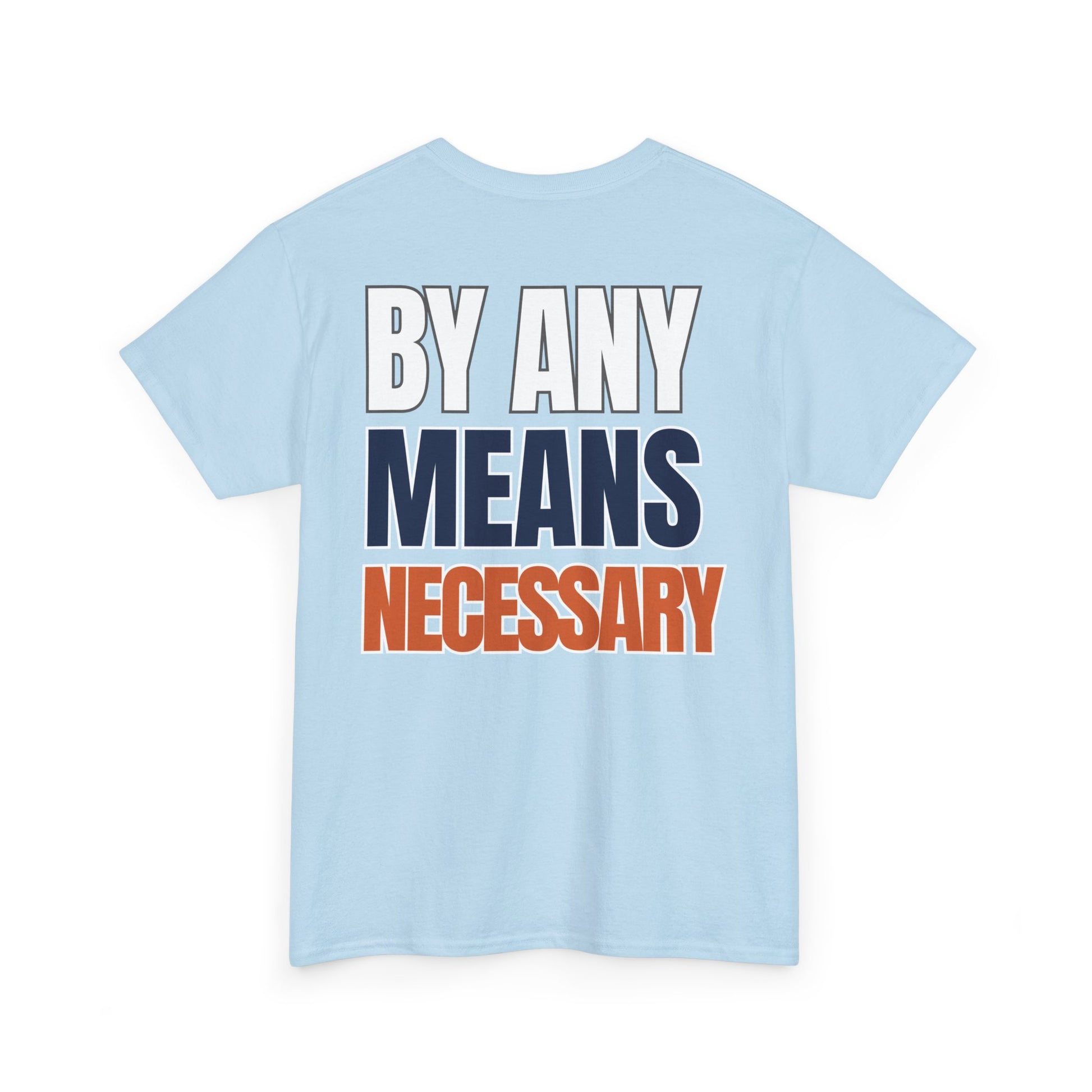 This classic crew shirt carries a quiet confidence—clean canvas, small chest emblem of an aggressive Chicago skyline design, and a bold back print that reads BY ANY MEANS NECESSARY in stacked navy, orange, and outlined white. It feels like a reliable companion: soft, breathable cotton with a structured neckline and a relaxed fit that moves with you. Wear it on a weekday errand run, a weekend watch party, or while coaching a team - it reads like someone who values steady improvement and understated style.