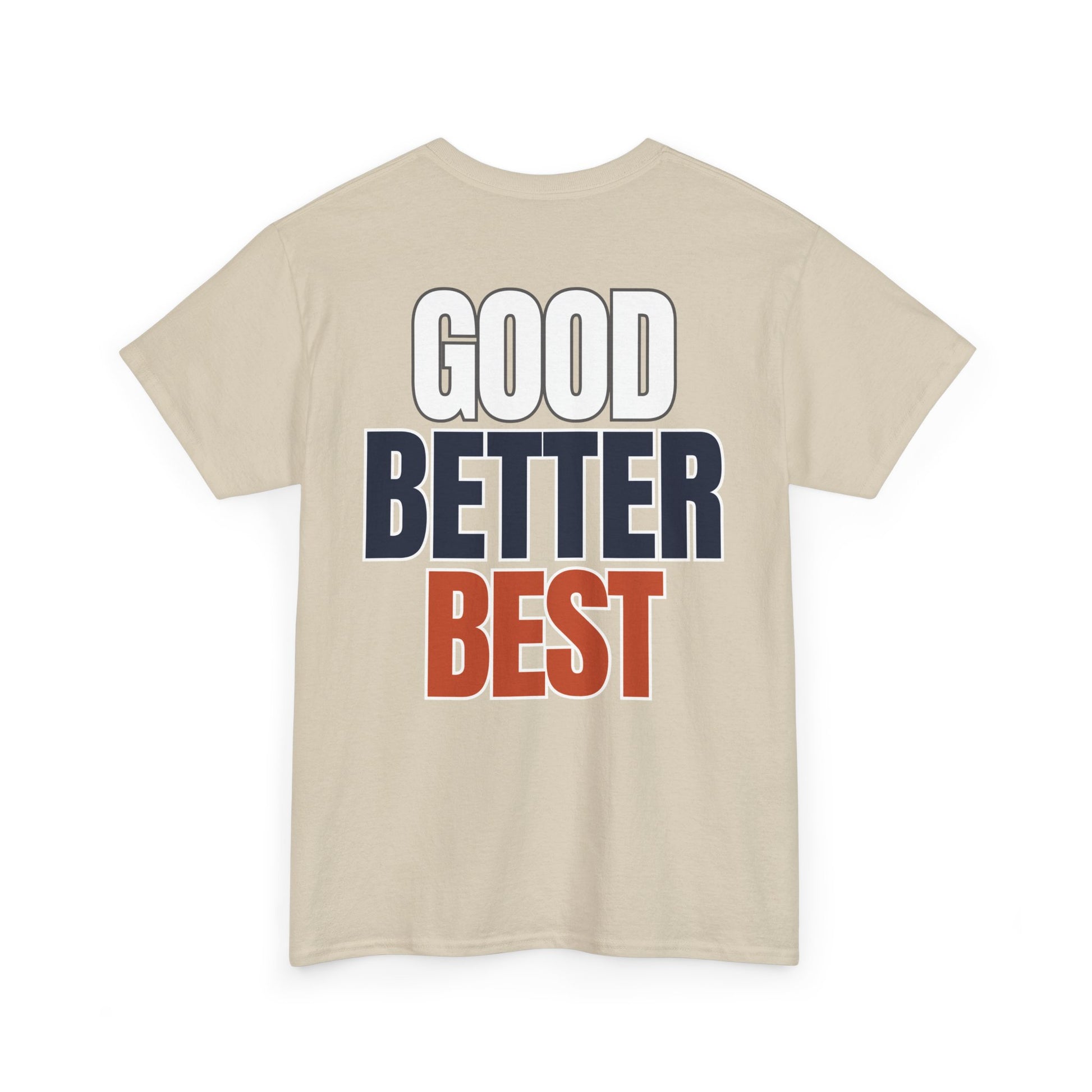 This classic crew shirt carries a quiet confidence—clean canvas, small chest emblem of an aggressive Chicago skyline design, and a bold back print that reads GOOD BETTER BEST in stacked navy, orange, and outlined white. It feels like a reliable companion: soft, breathable cotton with a structured neckline and a relaxed fit that moves with you. Wear it on a weekday errand run, a weekend watch party, or while coaching a team - it reads like someone who values steady improvement and understated style.
