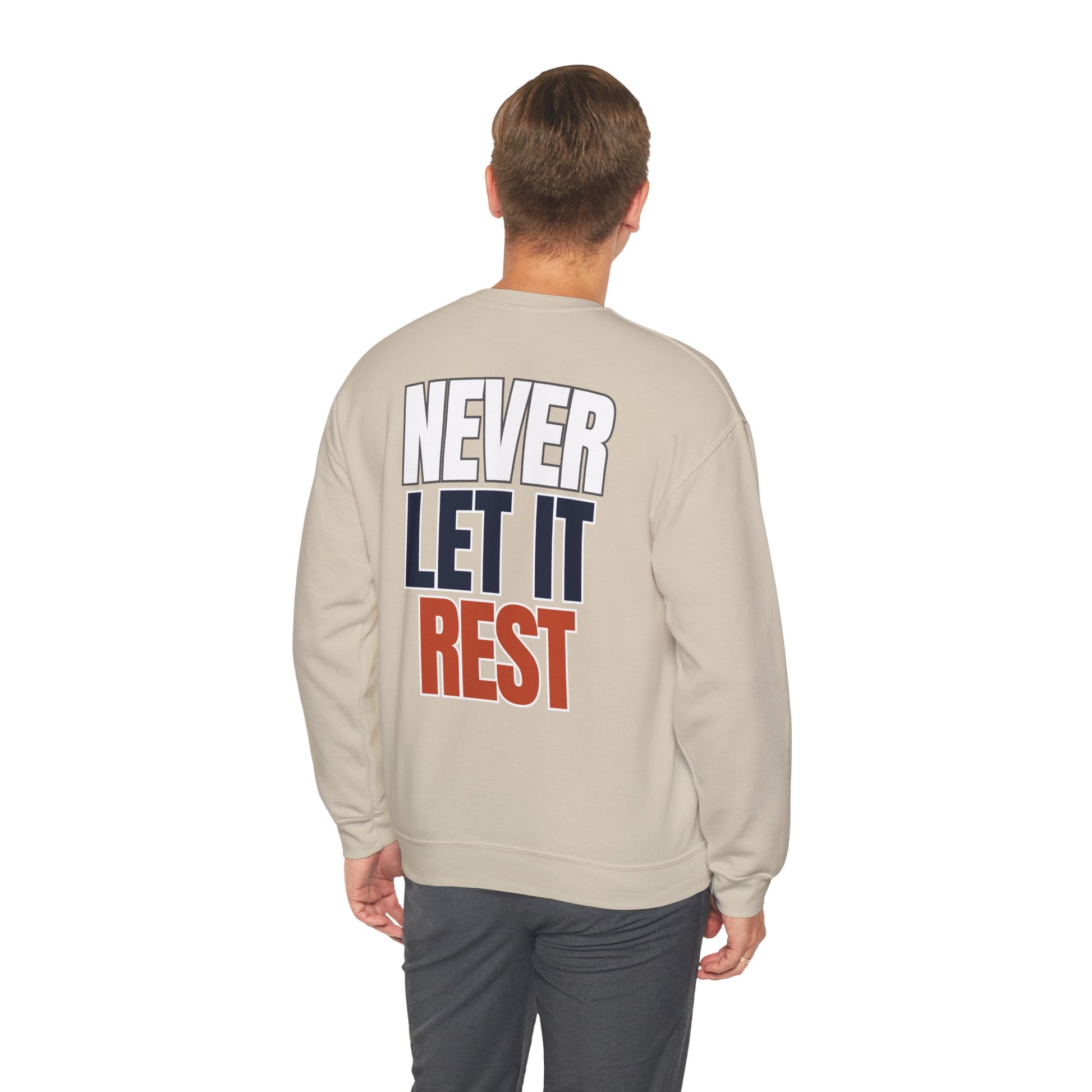 This cozy crewneck sweatshirt wears Chicago confidence like a badge. The front features a bold remake of the Chicago skyline, while the back makes the message loud and clear with block lettering that reads NEVER LET IT REST in layered navy and rust tones. It feels soft against the skin thanks to a medium-heavy 50/50 cotton–poly blend and a tear-away label so nothing itches. Thoughtful construction (tubular knit, double-needle stitching) keeps the silhouette clean and durable through repeat wears. Subtle enough for everyday layering, bold enough to make your intent known on mornings when you want to move forward with purpose.