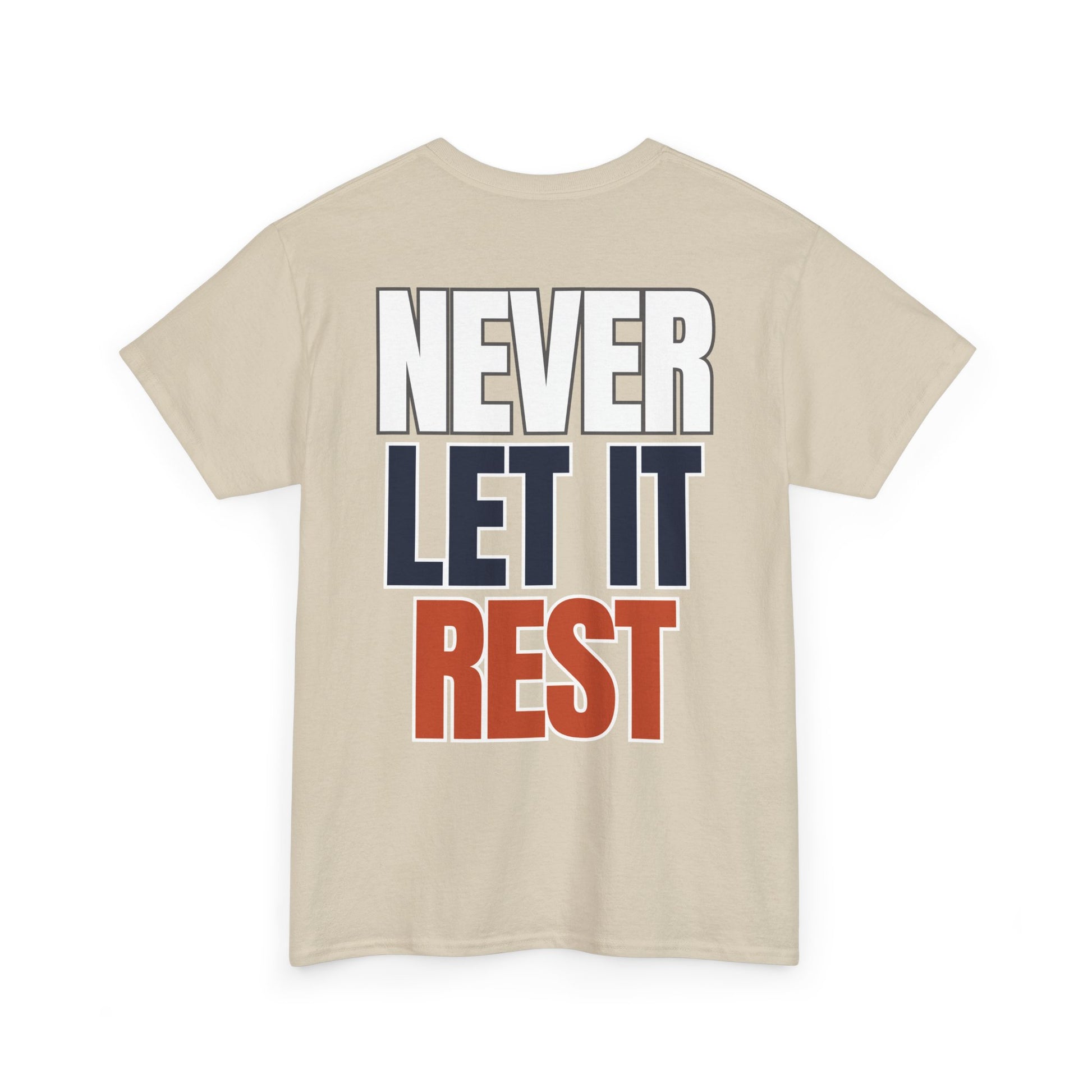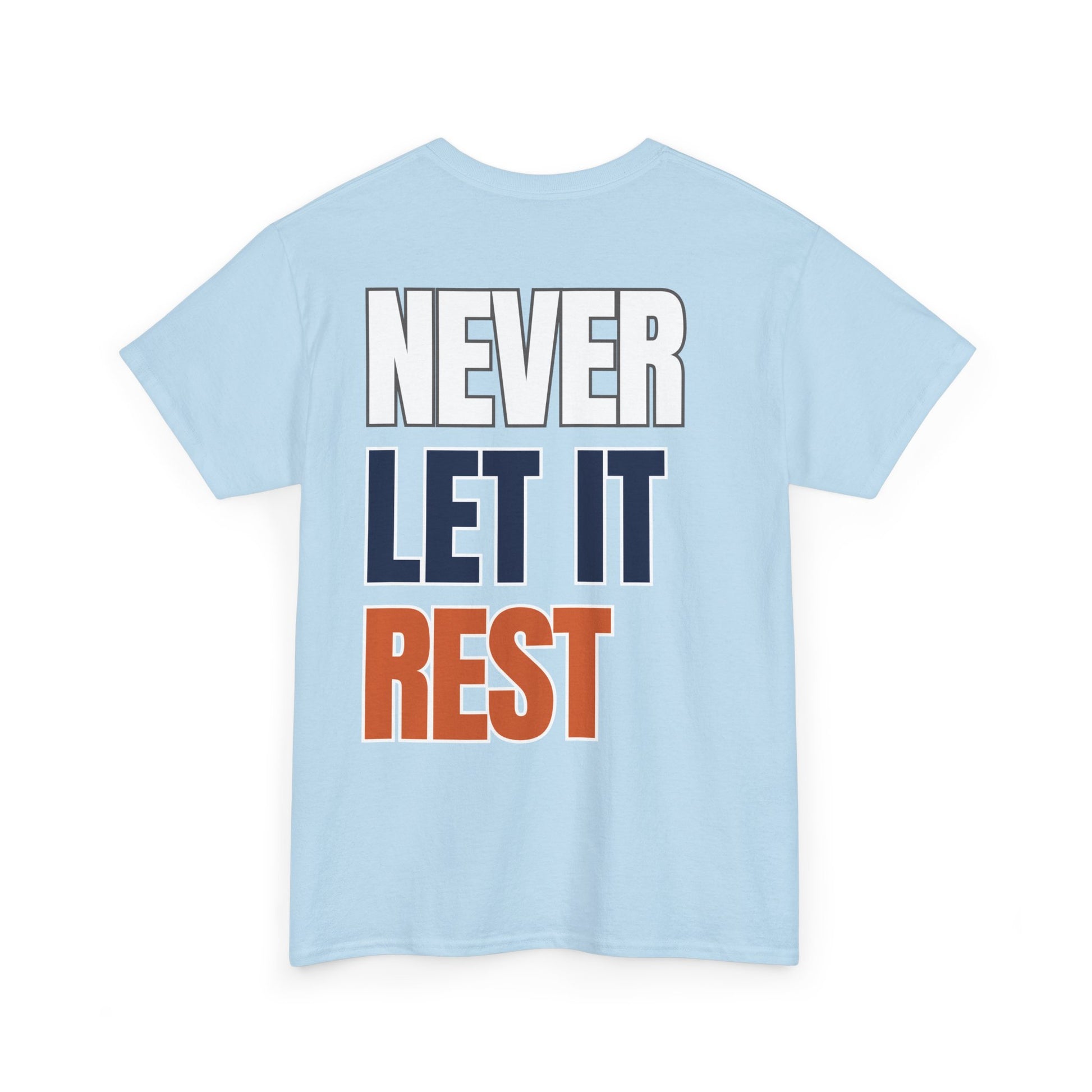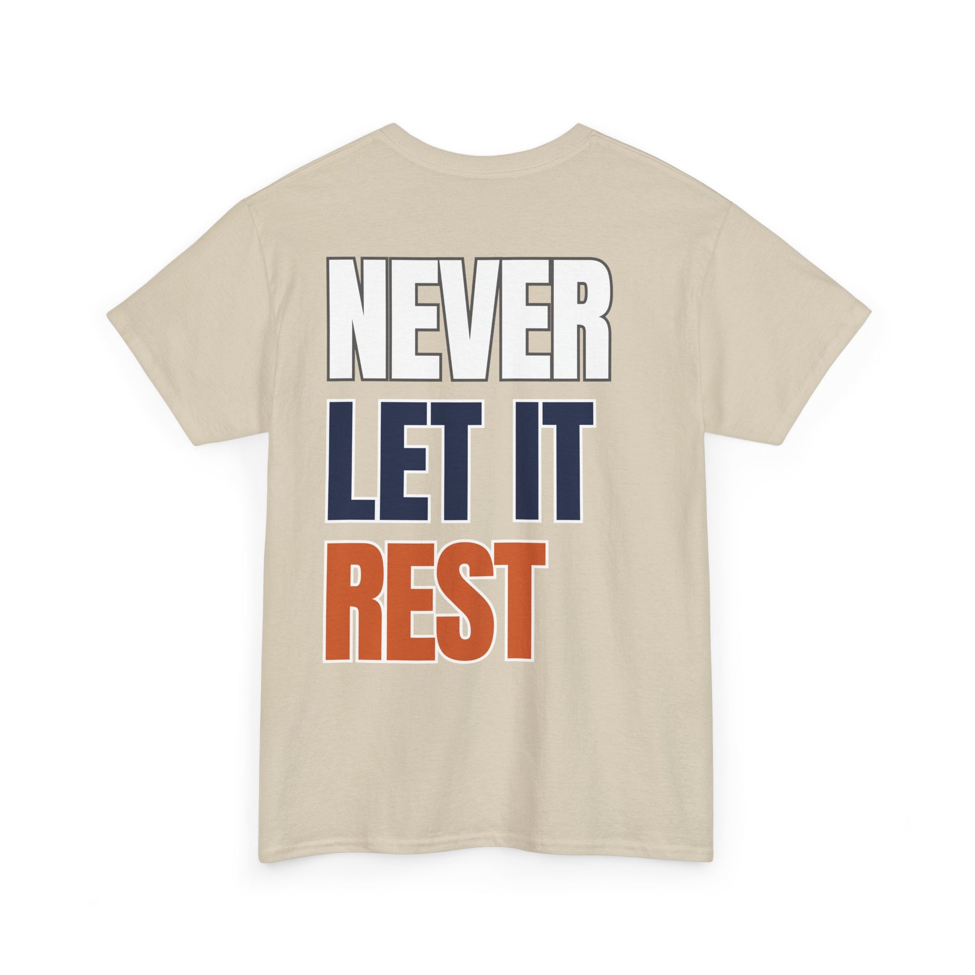 This classic crew shirt carries a quiet confidence—clean canvas, small chest emblem of an aggressive Chicago skyline design, and a bold back print that reads NEVER LET IT REST in stacked navy, orange, and outlined white. It feels like a reliable companion: soft, breathable cotton with a structured neckline and a relaxed fit that moves with you. Wear it on a weekday errand run, a weekend watch party, or while coaching a team - it reads like someone who values steady improvement and understated style.