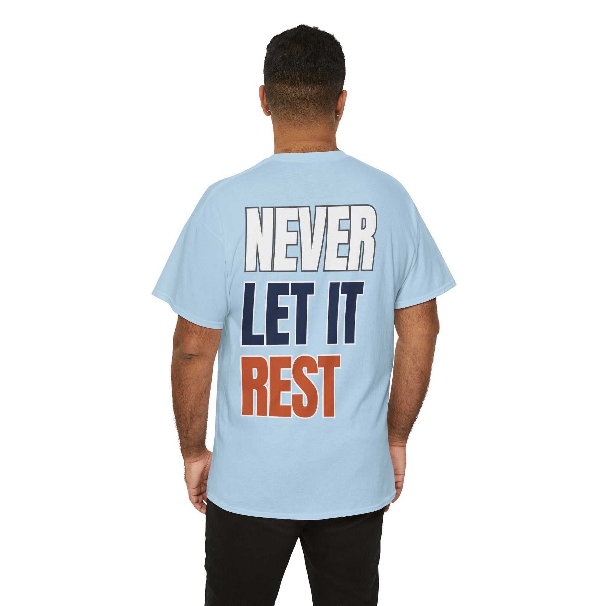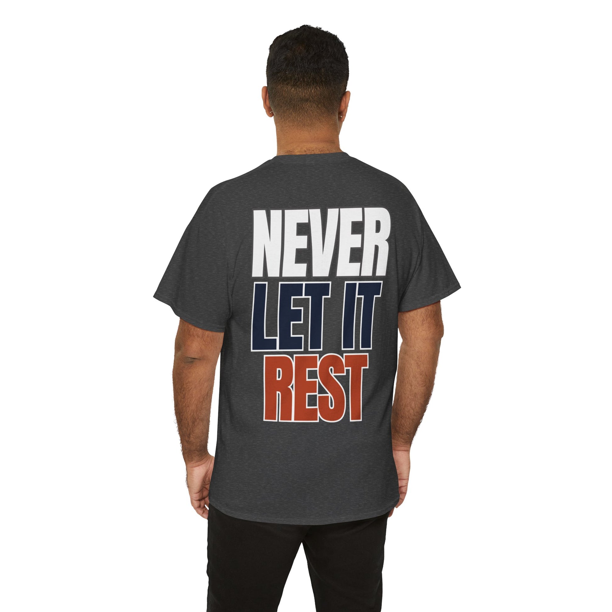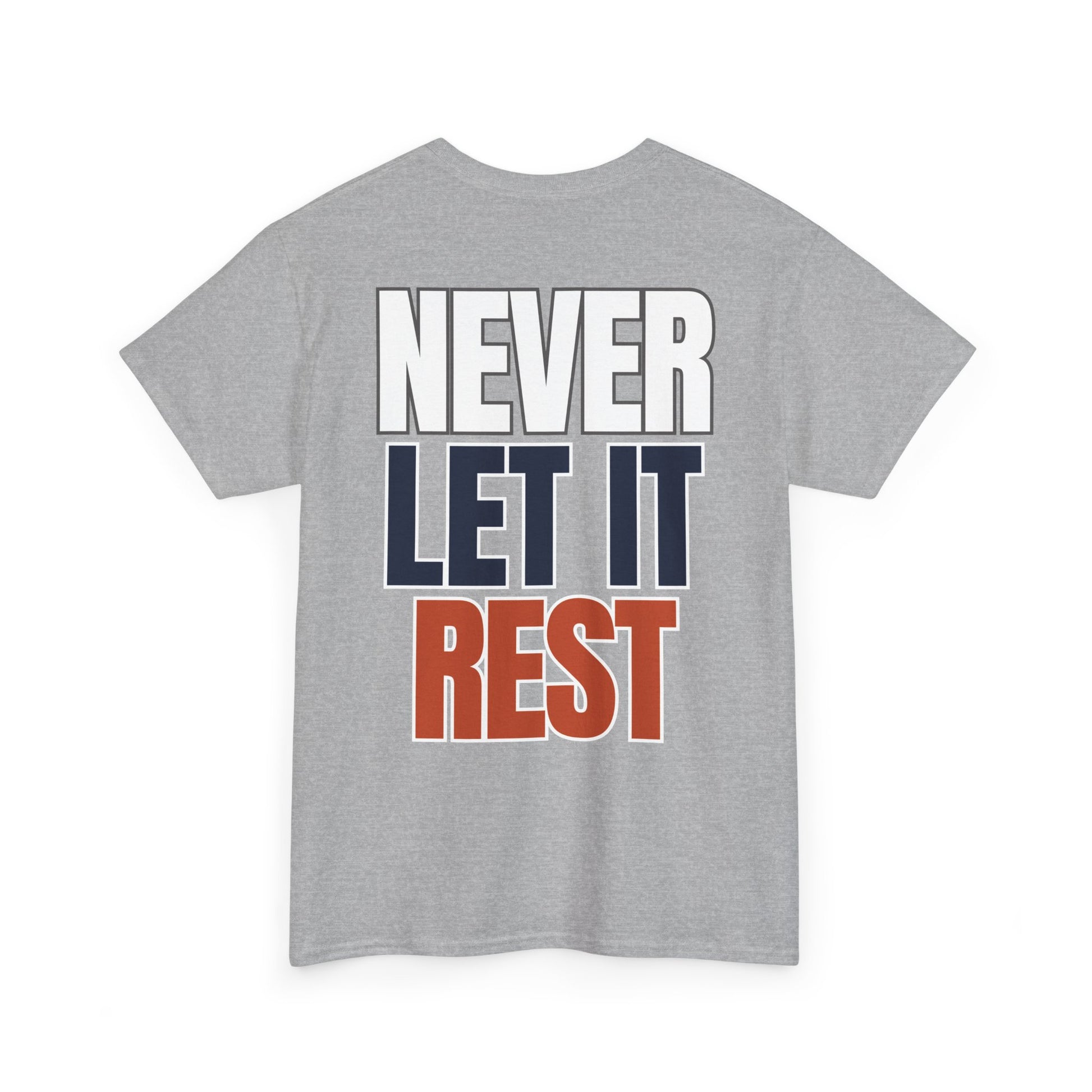 This classic crew shirt carries a quiet confidence—clean canvas, small chest emblem of an aggressive Chicago skyline design, and a bold back print that reads NEVER LET IT REST in stacked navy, orange, and outlined white. It feels like a reliable companion: soft, breathable cotton with a structured neckline and a relaxed fit that moves with you. Wear it on a weekday errand run, a weekend watch party, or while coaching a team - it reads like someone who values steady improvement and understated style.