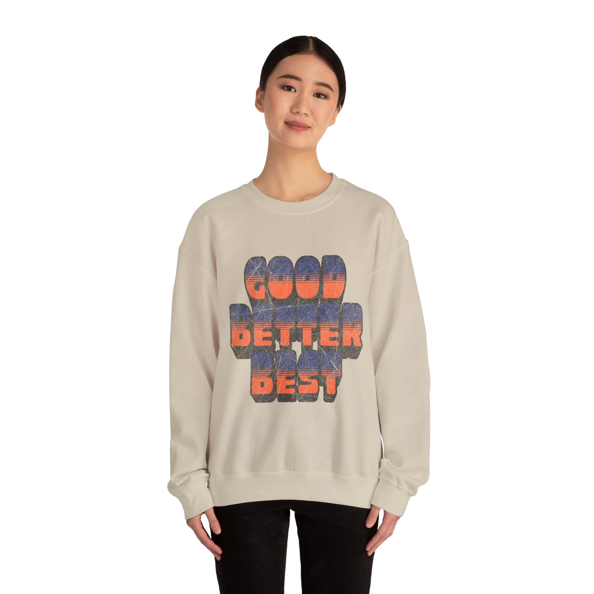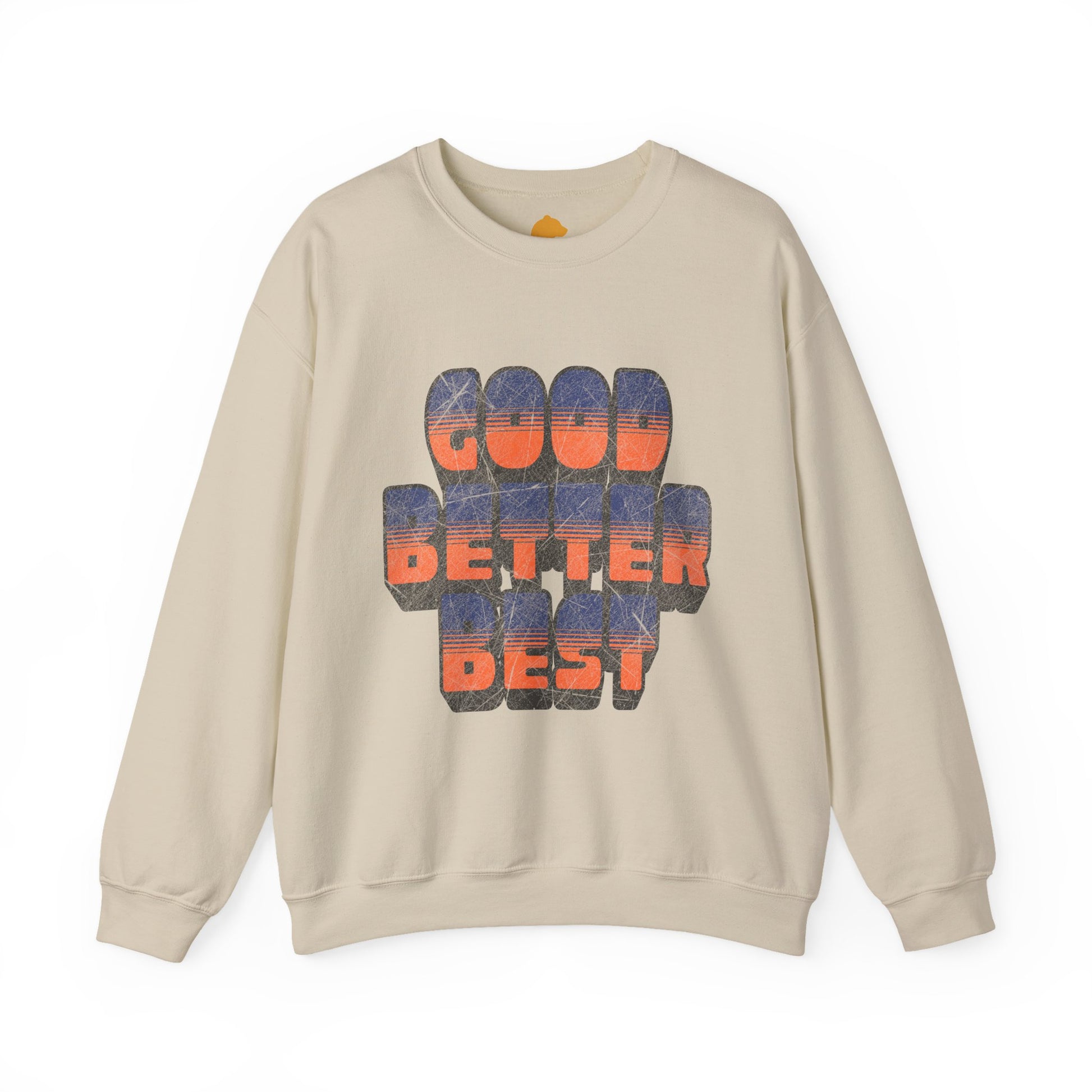 This retro-inspired crewneck brings chill comfort and old-school charm to everyday life. Soft, medium-weight fabric wraps you in warmth without feeling bulky, while the retro-style “Good Better Best” across the chest gives a playful, competitive edge — great for cheering at the game, running quick errands, or lounging between plans. The clean crew neckline and classic fit keep the silhouette simple and familiar. Built with durable double-needle stitching and thoughtful details like a tear-away label, it’s made to last and to be reached for on cool mornings and late nights alike. Whether you’re heading to a tailgate, a study session, or grabbing coffee, this sweatshirt slips into your routine and adds a touch of retro team spirit.