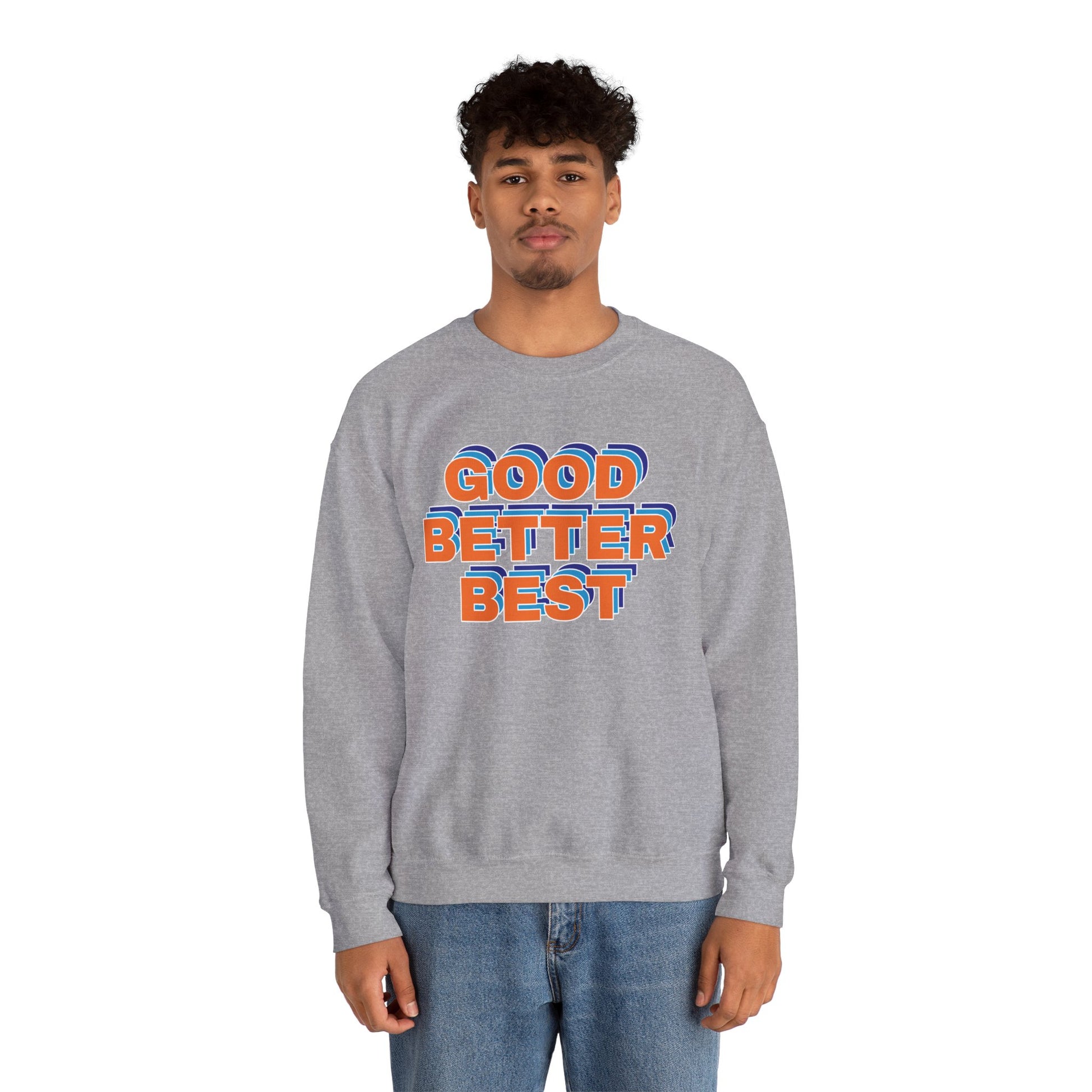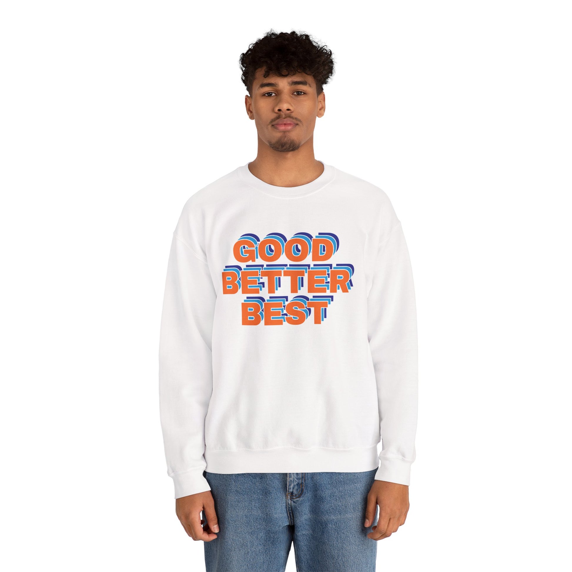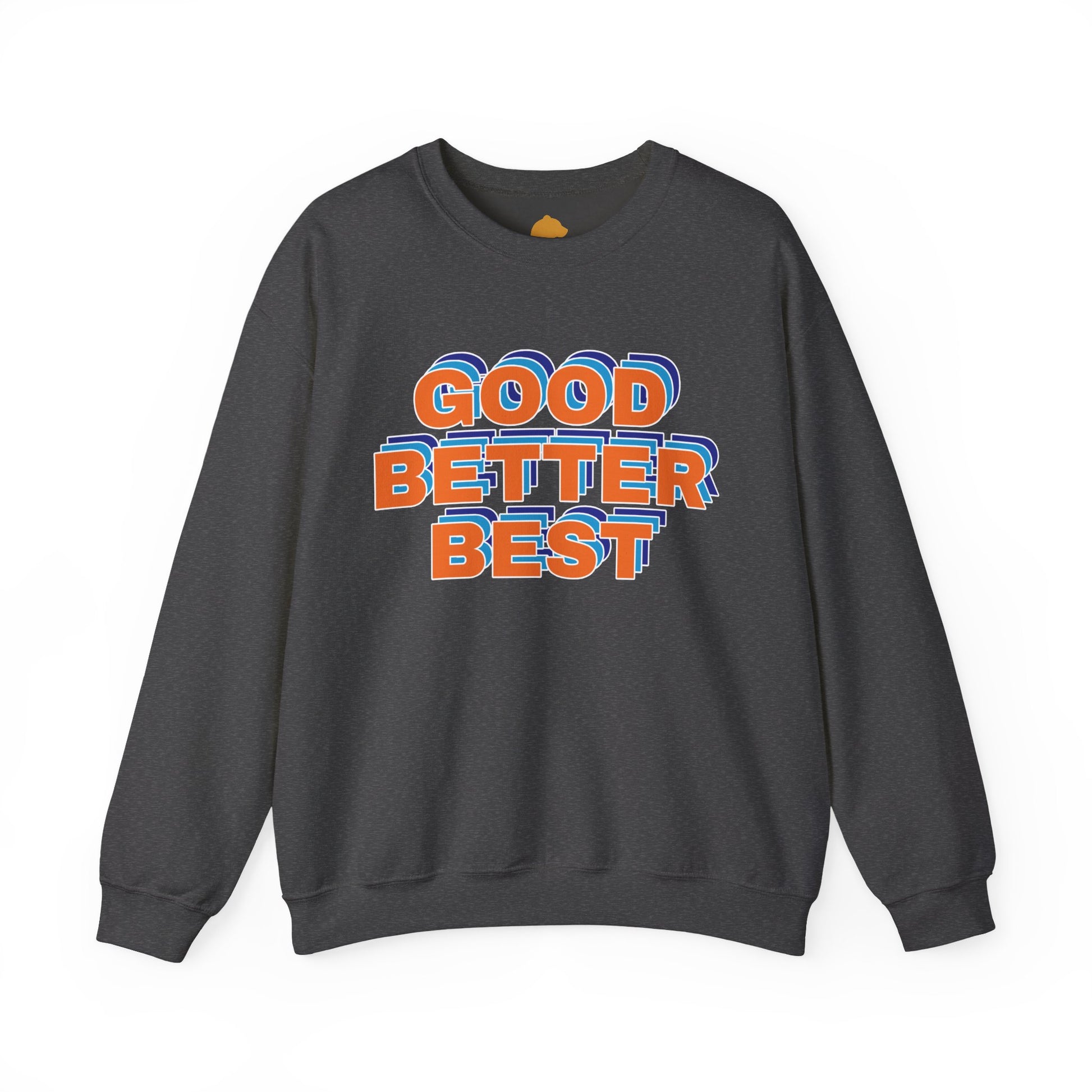 This retro-inspired crewneck brings chill comfort and old-school charm to everyday life. Soft, medium-weight fabric wraps you in warmth without feeling bulky, while the retro-style “Good Better Best” across the chest gives a playful, competitive edge — great for cheering at the game, running quick errands, or lounging between plans. The clean crew neckline and classic fit keep the silhouette simple and familiar. Built with durable double-needle stitching and thoughtful details like a tear-away label, it’s made to last and to be reached for on cool mornings and late nights alike. Whether you’re heading to a tailgate, a study session, or grabbing coffee, this sweatshirt slips into your routine and adds a touch of retro team spirit.