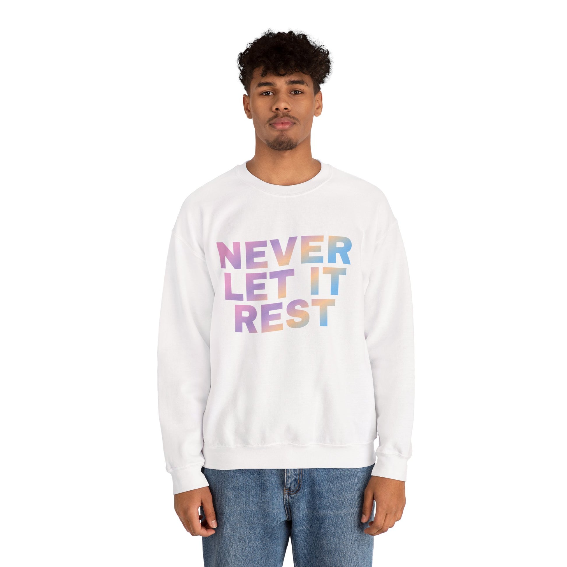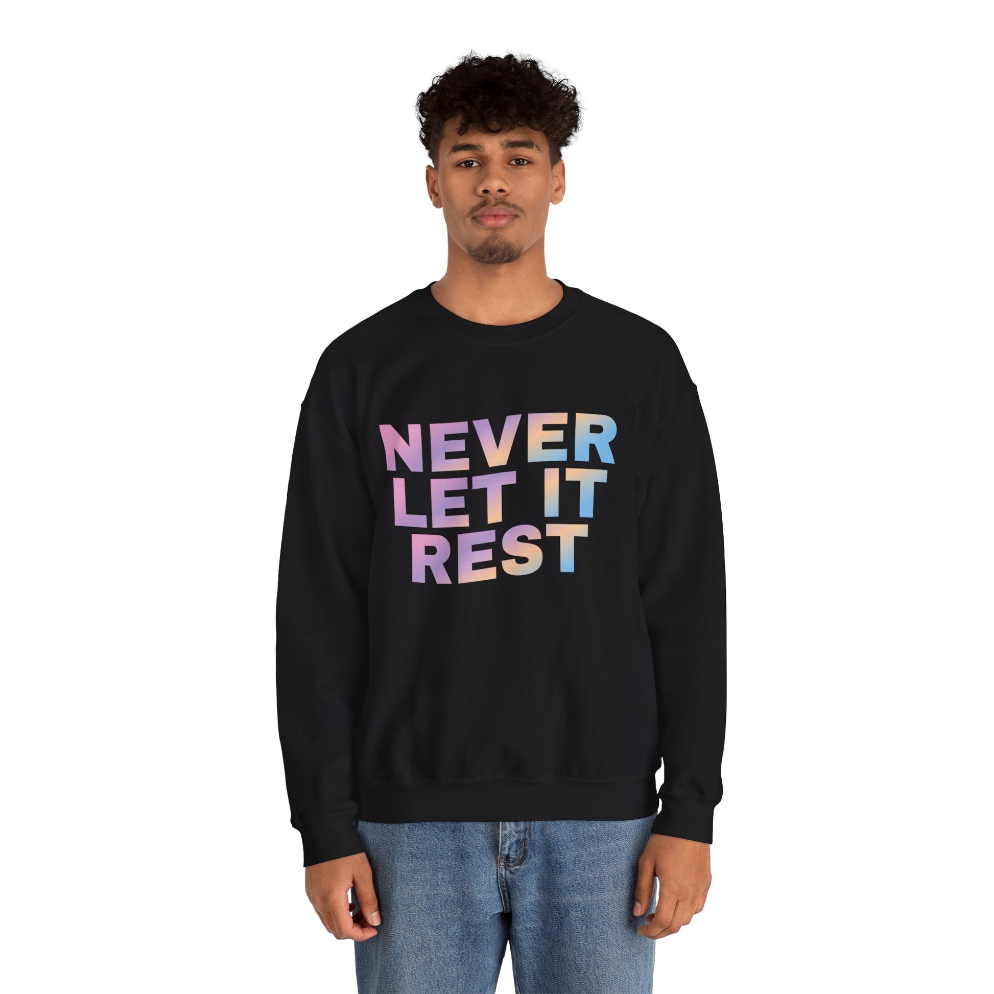 This retro-inspired crewneck brings chill comfort and old-school charm to everyday life. Soft, medium-weight fabric wraps you in warmth without feeling bulky, while the retro-style “Never Let It Rest” across the chest gives a playful, competitive edge — great for cheering at the game, running quick errands, or lounging between plans. The clean crew neckline and classic fit keep the silhouette simple and familiar. Built with durable double-needle stitching and thoughtful details like a tear-away label, it’s made to last and to be reached for on cool mornings and late nights alike. Whether you’re heading to a tailgate, a study session, or grabbing coffee, this sweatshirt slips into your routine and adds a touch of retro team spirit.