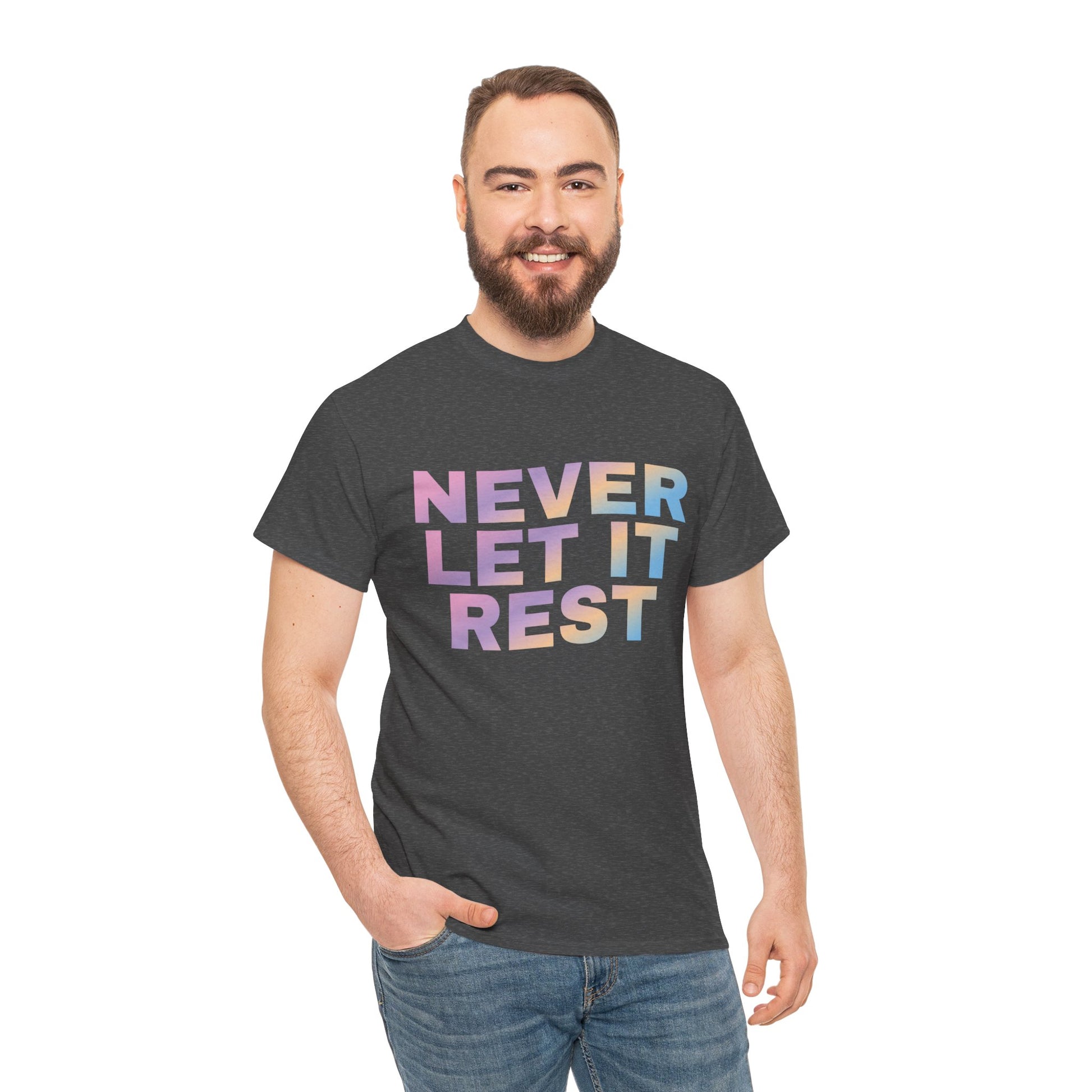This retro-inspired crewneck tee brings chill comfort and old-school charm to everyday life. The retro-style “Never Let It Rest” across the chest gives a playful, competitive edge - great for cheering at the game, running quick errands, or lounging between plans. The clean crew neckline and classic fit keep the silhouette simple and familiar. Whether you’re heading to a tailgate, a study session, or grabbing coffee, this shirt slips into your routine and adds a touch of retro team spirit.