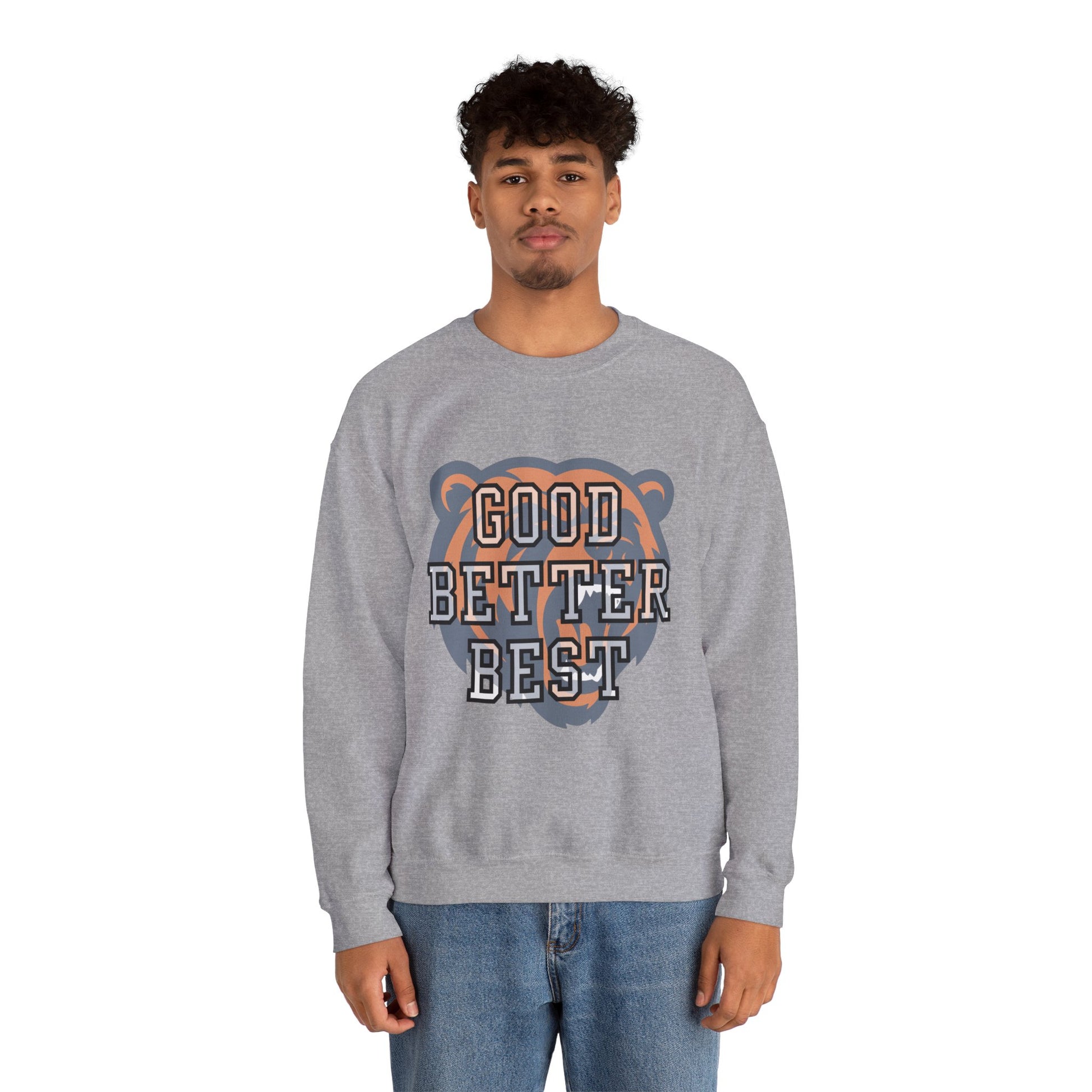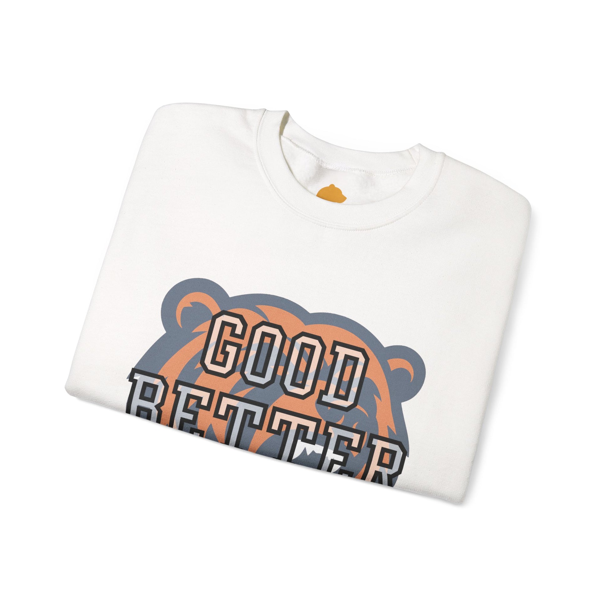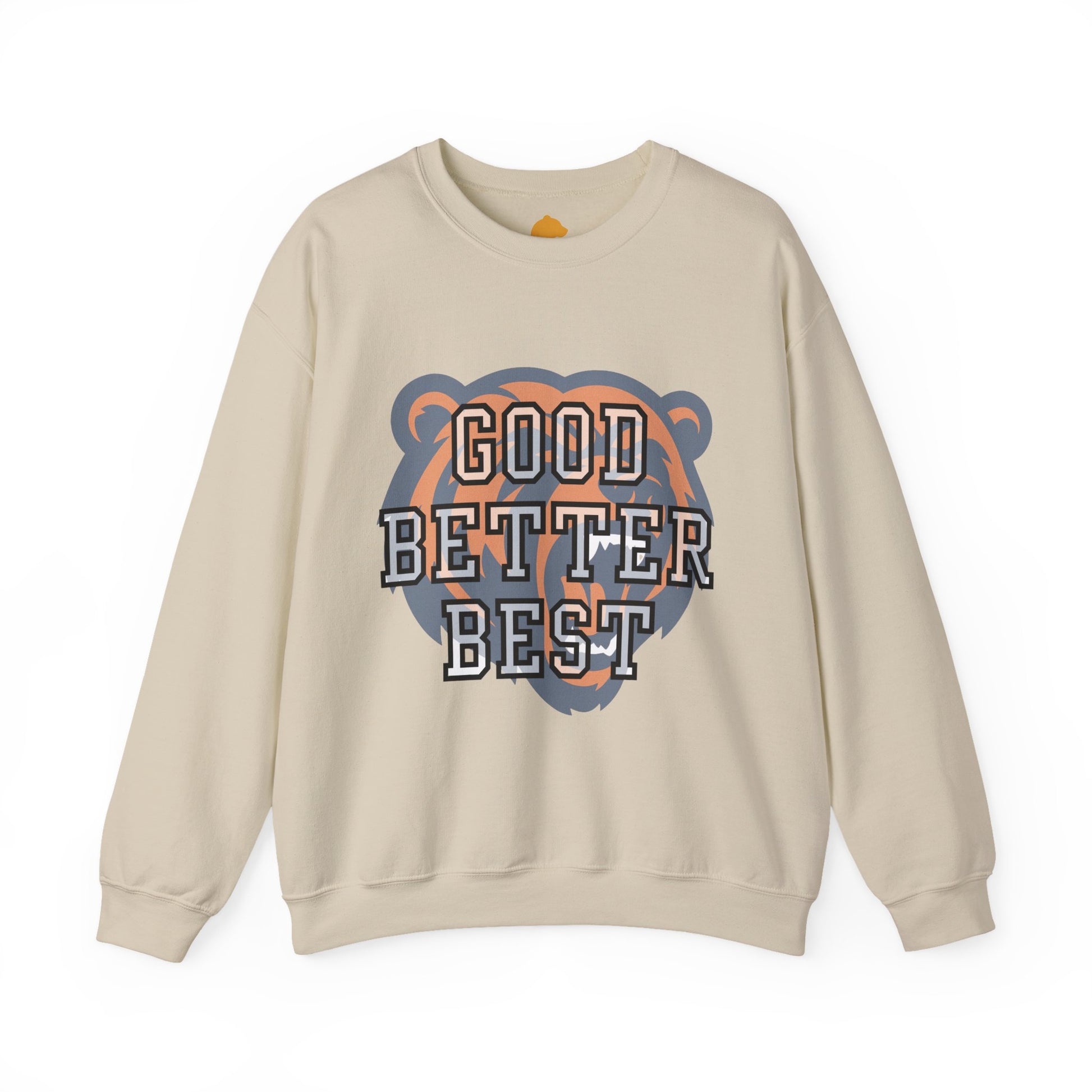 This cozy crewneck sweatshirt carries a playful, vintage-sports energy - a mighty bear graphic layered behind bold varsity lettering that reads “GOOD BETTER BEST”. The medium-heavy 50/50 cotton–poly blend drapes with a classic, relaxed fit and a soft hand that warms without feeling bulky. Double-needle stitching and a ribbed neckline, cuffs, and hem keep the shape season after season. Wear it to slow mornings with coffee, layered for outdoor practices, or as a comfortable top for casual game day watch parties - it settles into everyday life while giving a subtle, confident statement.